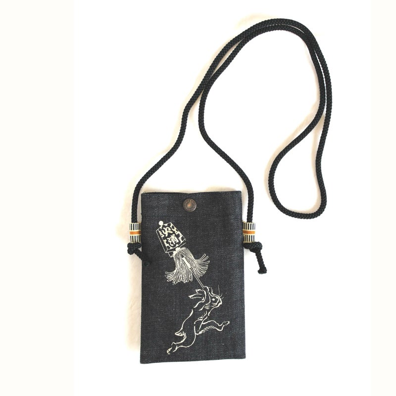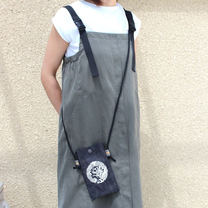 肩に掛けて、ご使用いただけます。 紐を通すループ部分は真田紐を使用。ボタン付きです。