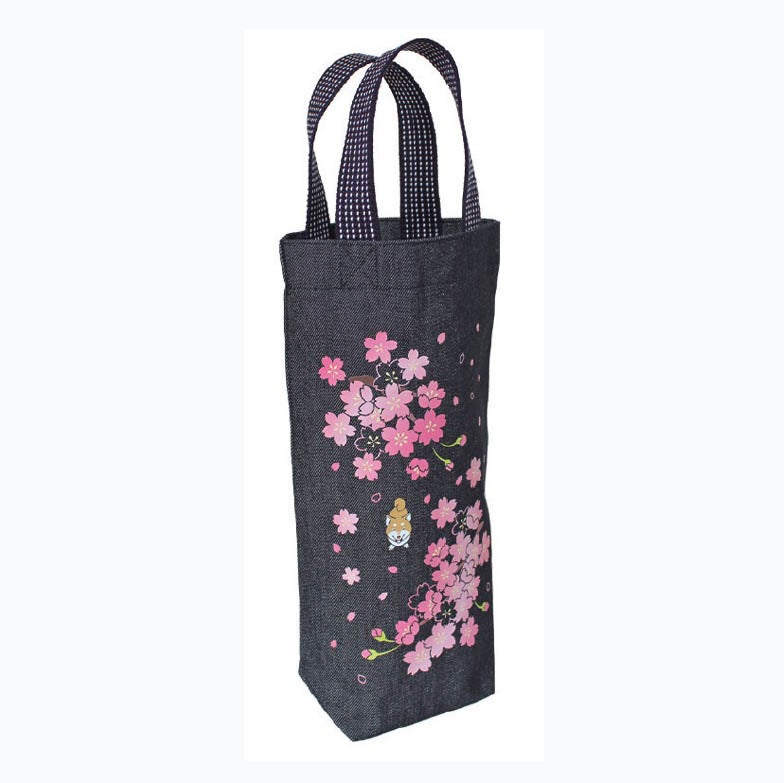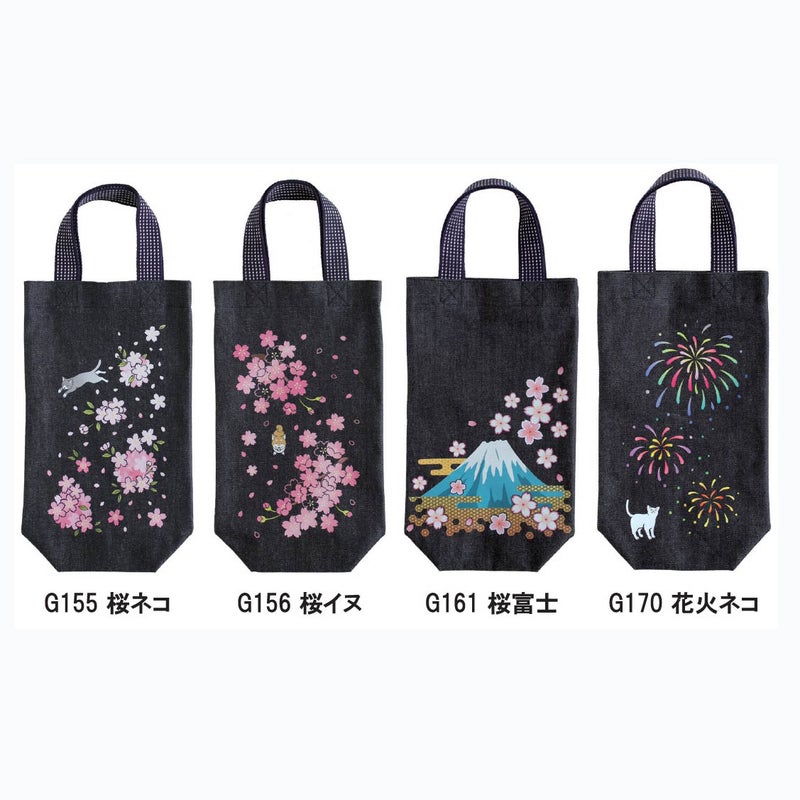 桜とネコ、イヌ柄などのデニムボトルバッグ