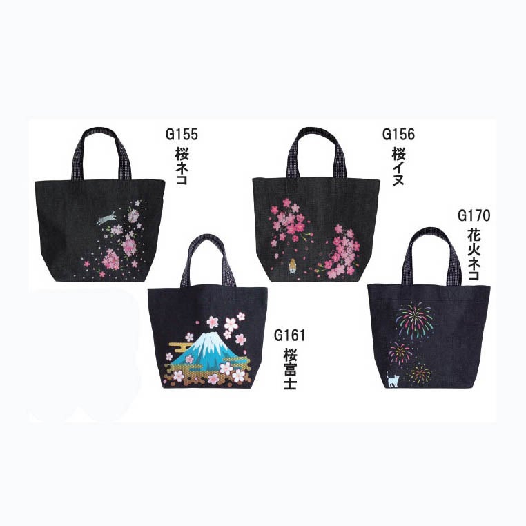 桜とネコ、イヌ柄などのデニムランチバッグ