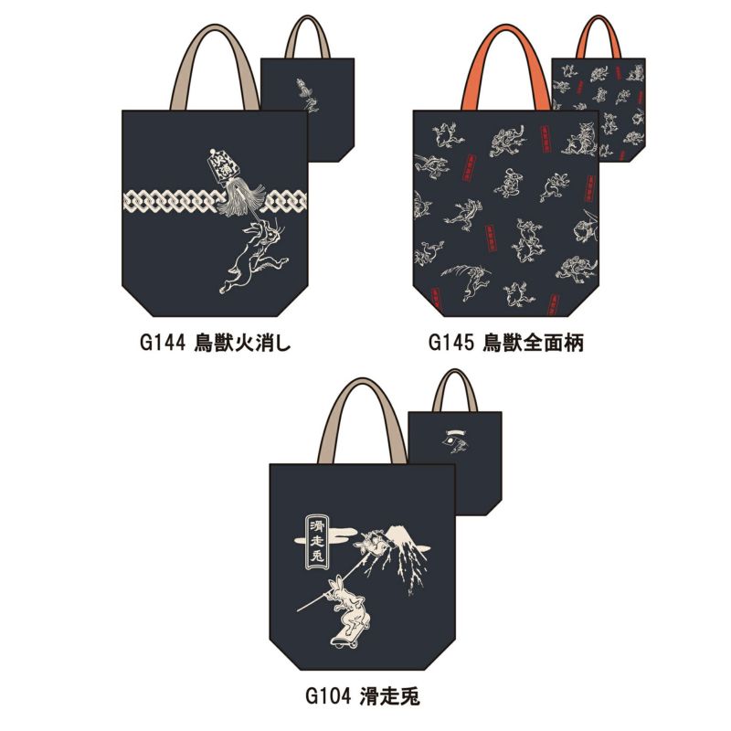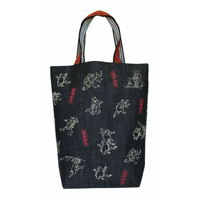 鳥獣戯画柄をプリントしたデニムトートバッグ